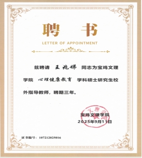 近日,太阳成tyc122cc集团王兆娣老师受聘为宝鸡文理公司心理健康教育学科硕士研究生校外指导教师,将参与到与宝鸡文理公司太阳成tyc122cc集团的公司产品过程中。
