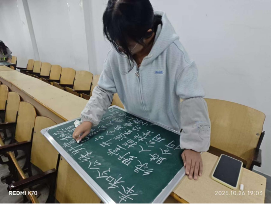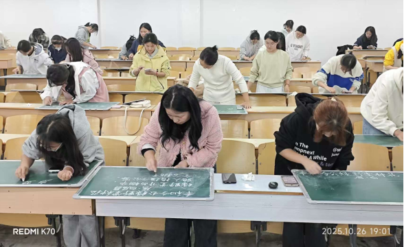 活动期间,同学们积极参与,认真投入。在书写现场,大家凝神聚气,手持粉笔,在小黑板上精心书写。作品或端庄大气的楷书,或舒展流畅的行书,展现了同学们在粉笔字书写方面的扎实基础和不断提升的专业技能。除了注重字迹工整与内容准确,同学们还在版面设计上巧妙构思,使标题、正文与落款协调有致、富有美感,体现出良好的综合版面表达能力。