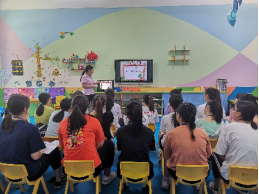 见习第一天,许苗园长向同学们介绍了幼儿园发展历程、办园理念、办学特色、教育课程并观看了幼儿园的宣传片。