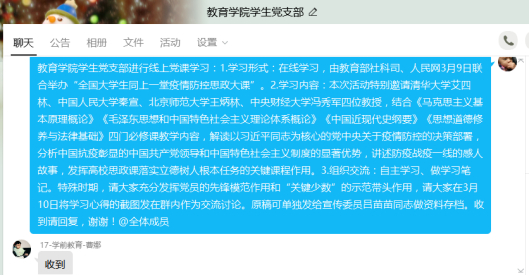 本次线上讨论将思想政治理论课教学优势转化为支持防疫斗争的强大力量,引导支部党员深刻认识到了中国抗疫彰显的中国共产党领导和中国特色社会主义制度的显著优势,增强了 “四个意识”、坚定了“四个自信”。 我们坚信在党的领导下胜利很快就会到来!