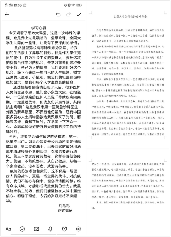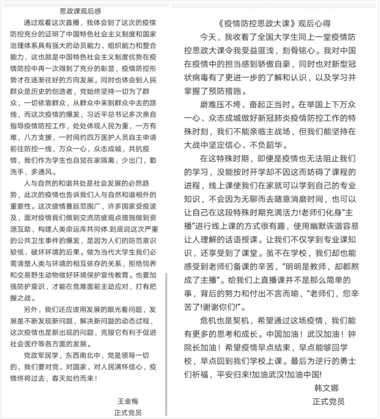 肩抗大任,心中有国,传承信念:支部党员余文文在心得体会中这样写:“曾经是你护我在身后,今天让我为你们撑起一片天。我们可以看到许多90后、00后的身影奋战在抗疫第一线,昨天人们口中的孩子,那些被保护的孩子们,如今已长大成人,在这场战斗中挺身而出,用自己的热血守护爱的人,是爱国情怀让这份责任接力到青年一代的手上,年轻人接过接力棒,面对挑战,我们敢于回应挑战,敢于担当时代使命,做好时代的接棒人。”
