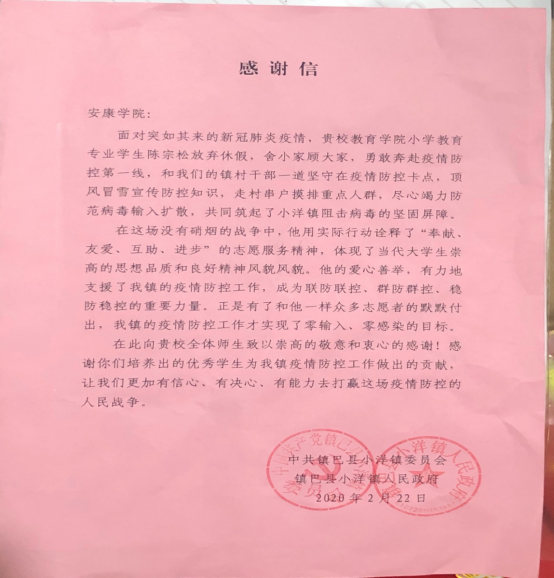 “在此向贵校全体师生致以崇高的敬意和衷心的感谢!感谢你们培养出的优秀员工为我镇疫情防控工作做出的贡献,让我们更加有信心、有决心、有能力去打赢这场疫情防控的人民战争。” 2月23日,太阳成tyc122cc集团收到来自汉中镇巴县人民政府的感谢信,对公司学子陈宗松积极参与当地防疫志愿服务工作进行表扬,尤其对其在抗击疫情的紧要关头,主动投身疫情防疫一线,充分发扬志愿服务精神及认真负责的工作态度给予肯定,同时对太阳成tyc122cc集团的人才培养工作表示感谢。