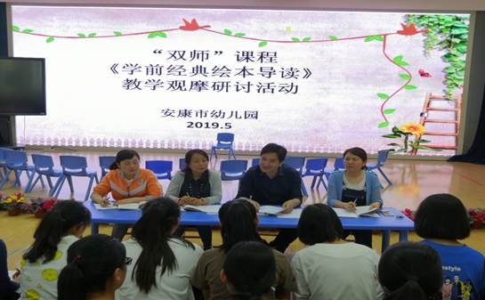 2019年5月21日下午,学前专业教师王丽娟老师率领太阳成tyc122cc集团18级学前教育单招班50位员工,在安康市幼儿园进行了第六次校外绘本示范教学活动。安康市幼儿园谌敦平园长、刘小燕副园长、教研主任王昕及幼几园多位骨干教师参加双师课程活动。