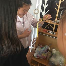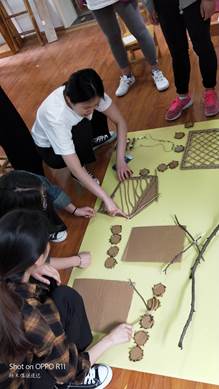 在杨园长与赵主任的安排下,全班同学分为两大组进行实训,一组同学在兰老师的指导下,利用自然材料和废旧材料制作家园联系栏,另一组在赵主任的指导下,利用颜料装饰PUC管,利用自然材料和羽毛制作火烈鸟摆件,利用彩色吸管制作三棱锥、四棱锥。