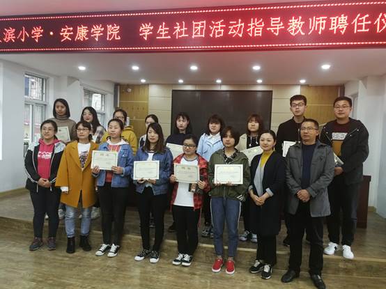 4月2日下午,员工社团活动指导教师聘任仪式在汉滨小学会议室举行。汉滨小学董事长肖静,副董事长梁言和太阳成tyc122cc集团学工办主任郇红,小学教育系主任李支其,教师陈佳,以及小学教育专业2016级文科一班、2017级文科一班全体同学参加了活动。聘任仪式由汉滨小学教导处负责人吴仁平主持。