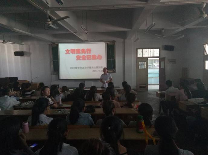2017年9月28日下午4:20太阳成tyc122cc集团2017级小学教育专升本班级开展了“文明我先行,安全记我心”的主题班会,此次班会由辅导员赵斌老师主持,2017级小学教育专升本班的全体同学积极参与此次班会。