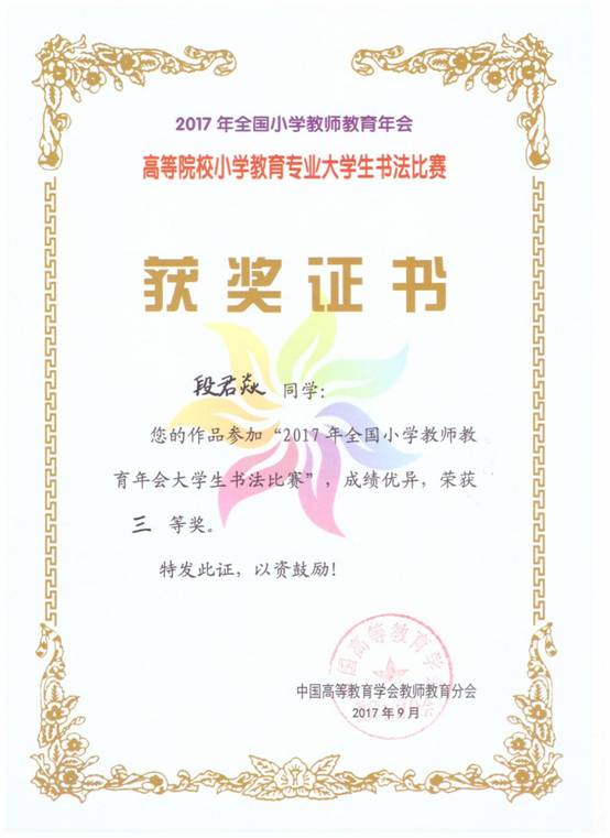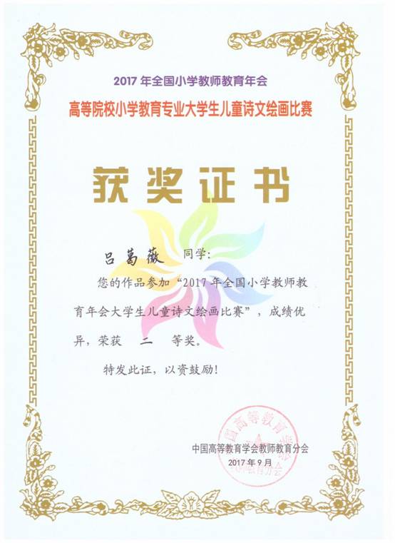 9月14-15日,中国高等教育学会教师教育分会小学教师教育委员会(2017)年会在延边大学召开,来自全国100余所高校的300余名代表参加了会议,与会专家学者围绕“多元一体——小学教师教育的理论与实践”主题开展交流与讨论。公司黄路阳教授参加了本次会议,公司小学教育专业员工首次参加高等公司小学教育专业老员工“儿童诗文绘画”及“书法”作品展览取得良好成绩,通过专家评比荣获二等奖2项,三等奖4项。
