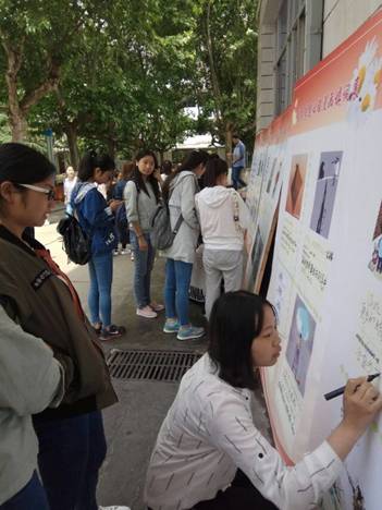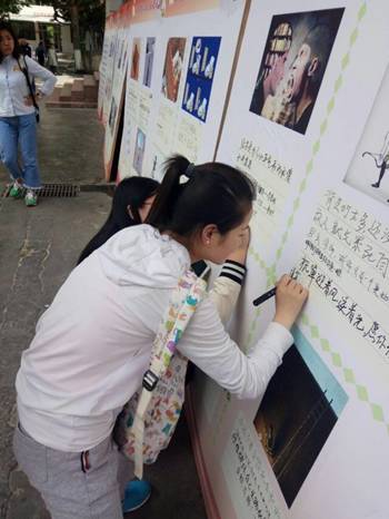 数张展板向公司广大师生陈列出了40多个形象生动的心理漫画,并且引导广大师生发挥自己的主观想象对漫画的寓意进行填充。这些漫画有引人深思的、有感人肺腑的、有鼓舞人心的……其中还有一部分以讽刺社会现状和人性丑恶为主题的漫画,这些漫画对现实的表现惟妙惟肖。林荫道展出的这些漫画在短短一天吸引了无数路过的师生,同学们在展板上写下了自己的理解,文字或幽默或深刻,这些文字不仅展现了师生们对不同事物的认知,同学们在分析漫画的过程中也调节了自己的心情。