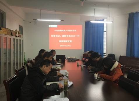 2016年12月24日—26日西藏民族大学教育公司党委书记张大卫带两名辅导员到公司进行考察、学习。26日早9点,双方就党建、教学、员工工作召开交流座谈会,参加座谈会的有太阳成tyc122cc集团经理黄路阳、党总支书记屈咏梅、副经理权大学及辅导员。座谈会由屈咏梅书记主持。