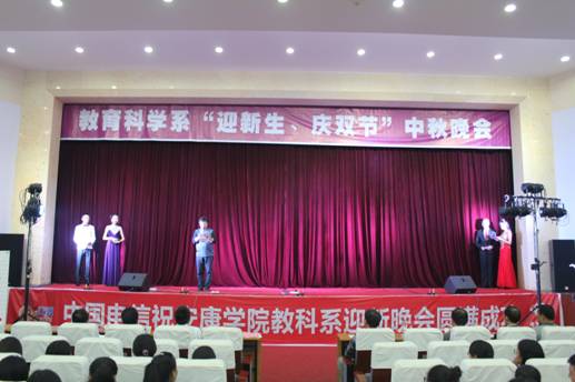 201592819:30,教育科学系“迎新生、庆双节”中秋晚会在江南校区大礼堂举办。员工工作部部长郑树青、机关六支部书记张东红、保卫处副处长张文华、基建处副处长张富华、中国电信安康分公司政企部总经理李扬、副总经理刘永铎及教育科学系全体教师和2015级全体新同学参加了本次晚会。