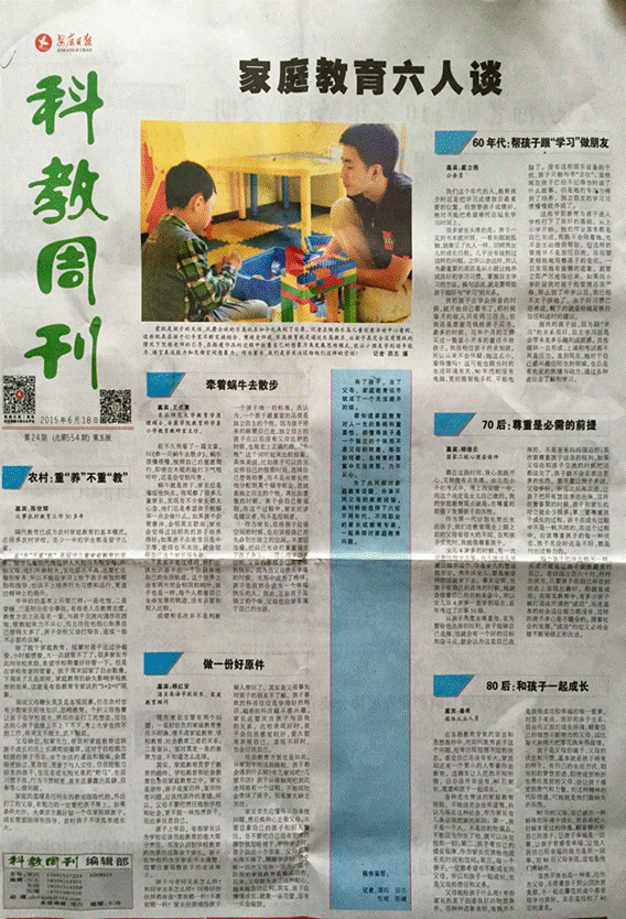 孩子是家庭的希望,是国家的未来。孩子的健康快乐成长需要家庭、公司、社会的多方合作,家庭教育在儿童成长过程中起着奠基性的作用。2015年春节前夕,国家主席习近平在新春团拜会上强调,家庭是社会的基本细胞,是人生的第一所公司,不论时代发生多大变化,不论生活格局发生多大变化,都要重视家庭建设,注重家庭、注重家教、注重家风。针对如何对孩子进行家庭教育,2015612日,安康日报科教周刊的记者张婧特约参访了我系小学教育教研室主任王贞惠老师、李尚明教授。