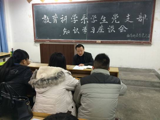 为了贯彻落实党的发展要求,教育科学系员工党支部按照中共中央办公厅《中国共产党发展党员工作细则》的精神,于20141124日在1404召开了教科系员工党支部知识学习座谈会,出席此次座谈会的有教育科学系员工党支部书记赵斌老师、系员工党支部成员、系员工党员和预备党员、以及各班团支书。