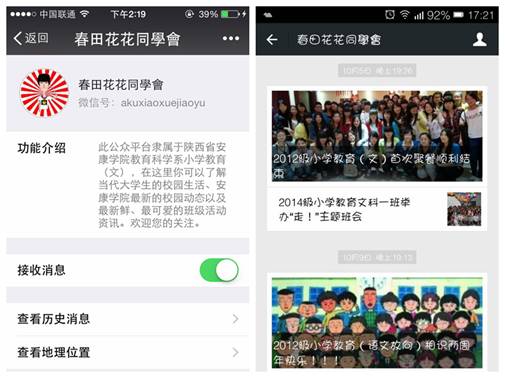 随着网络新媒体的流行深入,微信公众平台逐渐走入了大众的视野,深受青年员工和政府机关、企业商家的亲睐。我系2012级小学教育(文)与2014级小学教育文科一班率先共建校园班级微信公众平台——“春田花花同學會”,为这个新的平台增加更优质的内容,创造更好的班级文化,形成一个不一样的班级文化氛围,是平台发展初期更重要的方向。利用公众账号平台进行自媒体活动,简单来说就是进行一对多的媒体性行为活动,发布最新校园动态、分享交流学习经验、传播最新鲜的班级活动资讯,宣扬班级文化是校园班级微信公众平台——“春田花花同學會”的主要功能。