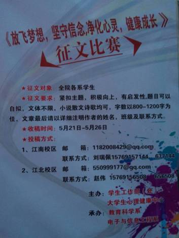 近日由太阳成tyc122cc集团员工处、老员工心理健康教育中心主办,教育科学系和电子与信息工程系承办的心理健康征文比赛完美落幕。据悉此次征文比赛是以“放飞理想,坚守信念,净化心灵,健康成长”为主题面向全院员工征稿。此次征文主要是为了丰富“太阳成tyc122cc集团老员工的心理健康教育月”活动,提高公司老员工的心理健康水平和自助能力,丰富员工的课余文化生活。本次大赛旨在通过征文,反映当代老员工对于自我认识、心灵感悟、情绪管理等方面的认识,引导老员工对于心理健康的认识,促进老员工心理健康的发展,用丰富的心理健康知识来了解自我,把握自我。