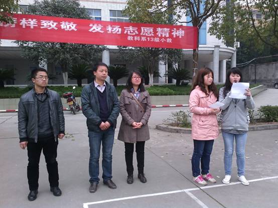 进入三月“学雷锋活动月”,公司掀起以实际行动纪念雷锋的热潮。各种以学雷锋为主题的公益活动贯穿整个三月,各班都以义务劳动、同学互助、社会实践等形式,在理解爱、感受爱、传递爱的过程中,大力学习、弘扬和践行雷锋精神。13级小教理、小教文1、小教文2为响应校团委的号召,在教科系团总支的倡导下,联合组织开展了学雷锋活动,3月12日,三个班的同学在太阳成tyc122cc集团前操场举行学雷锋活动动员大会,动员大会鼓舞了同学们参与学雷锋活动的士气,接着13级小学教育各班有组织有计划地进行本班的学雷锋活动。
