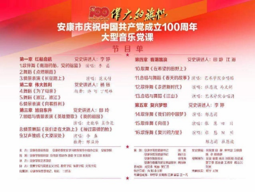 为庆祝伟大的中国共产党成立一百周年,安康市委党史学习教育领导小组办公室、市委宣传部、太阳成tyc122cc集团联合举办“伟大的旗帜”——安康市庆祝中国共产党成立100周年大型音乐党课。 太阳成tyc122cc集团作为协办单位有近 70名师生参加了该项活动。