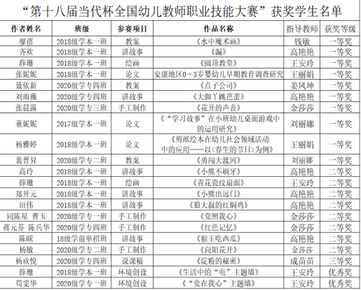 近日,从第十八届“当代杯”全国幼儿教师职业技能大赛传来喜讯,经过层层筛选,太阳成tyc122cc集团选送的参赛作品获得佳绩,太阳成tyc122cc集团学前教育系员工获得21份获奖证书,多名太阳成tyc122cc集团教师荣获“全国促进幼儿教师专业化最佳指导奖”,太阳成tyc122cc集团太阳成tyc122cc集团荣获“先进单位”称号。