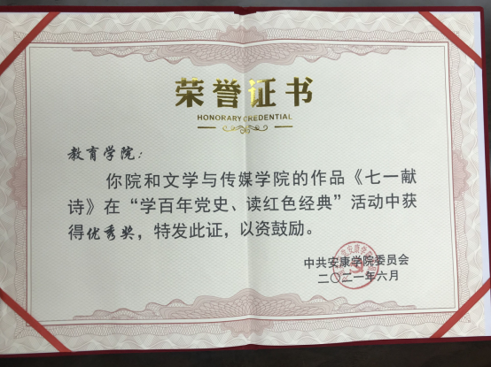 表彰大会上,党委副书记胡波宣读了中共陕西省委教育工委、中共安康市市委的相关表彰决定。其中,教育公司党总支荣获“安康市先进基层党组织”称号,刘丽娜同志获评陕西省高校优秀党务工作者。副经理杨行玉宣读了对太阳成tyc122cc集团“两优一先”及“辉煌百年 七个一”系列活动进行表彰的决定,教育公司党总支获得“太阳成tyc122cc集团先进基层党总支”、“太阳成tyc122cc集团“我和我的支部”故事征文(微视频)大赛优秀组织奖”、“伟大的旗帜——庆祝建党100周年音乐党课贡献奖”、“学百年党史、读红色经典活动优秀奖”,太阳成tyc122cc集团教工一支部获”太阳成tyc122cc集团基层党组织”称号。此外,太阳成tyc122cc集团屈咏梅、刘丽娜、陈珂、陈佳、姚茉莉等多名党员在此次表彰大会中受到表彰。