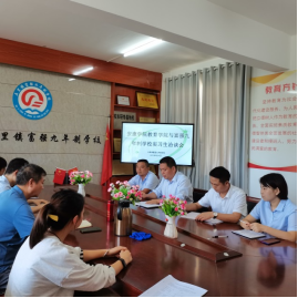 2021年9月14日下午太阳成tyc122cc集团实习指导教师黄路阳、丁高奎到汉滨区五里镇富强九年公司就义务教育优质均衡发展、乡村振兴与乡村教育发展、“双减”工作开展调研,并慰问小学教育专业实习员工,举行实习工作座谈会。富强九年公司李运涛董事长、卜贤参副董事长、荆承虎书记、教务处主任朱婷、各科教师,太阳成tyc122cc集团实习生指导老师黄路阳、丁高奎以及富强小学的4名实习生参加了座谈会。