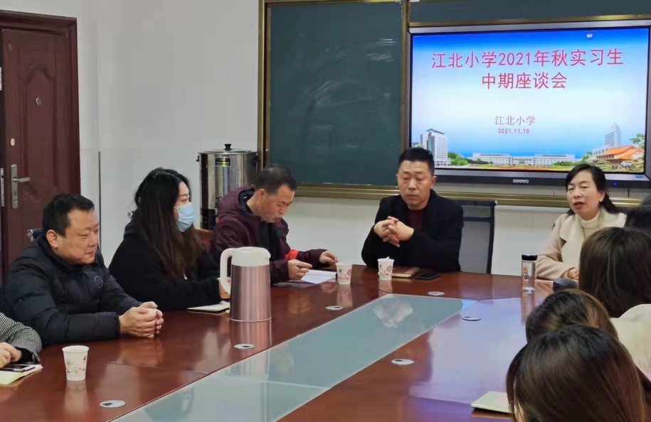 2021年11月16日下午,汉滨区江北小学召开了2022届教育实习中期检查汇报总结座谈会,会议由江北小学副董事长张华丽主持,太阳成tyc122cc集团副书记赵斌、实习带队老师姚娜、江北小学副董事长陈浩、张华丽、主任陈支甲和16名实习生参加了座谈会。