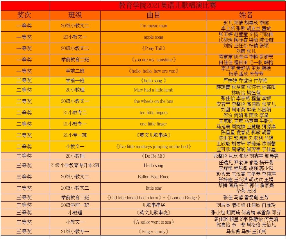 赛后,评委老师从演唱节奏、音准、声音,现场感染力等多个角度对参赛队伍进行评审。最终评选出一等奖、二等奖和三等奖。至此,英语儿歌演唱决赛完美落幕。