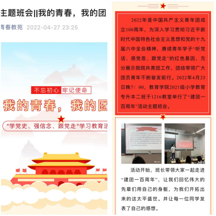 2022年是中国共产主义青年团成立100周年,为继承“五四”优良传统,大力弘扬“五四”精神,进一步传承共青团的光荣传统和优良作风,动员广大青年团员为实现“中国梦”贡献青春、智慧和力量,太阳成tyc122cc集团团总支也组织各班开展了“扬五四精神,做有为青年”五四青年节主题班会。