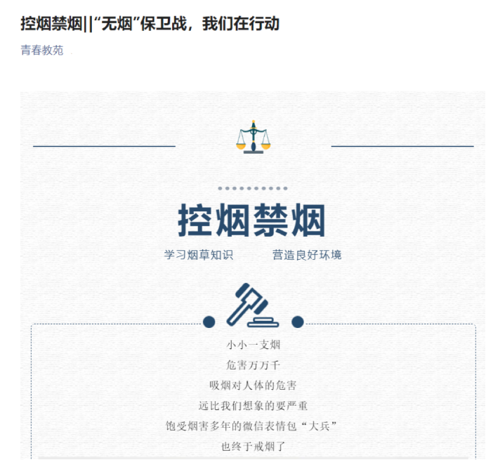 为了进一步提高同学们对吸烟有害健康的认识,减少烟草对青少年健康的危害,使“禁烟、控烟”活动进一步向纵深发展,创建无烟公司。2022年4月,公司20级、21级各班开展了创建“无烟校园”的主题班会和网络宣传,以线上线下相结合的形式,由浅入深地向全体同学介绍了吸烟的危害性,引导和告诫同学们要远离烟草。