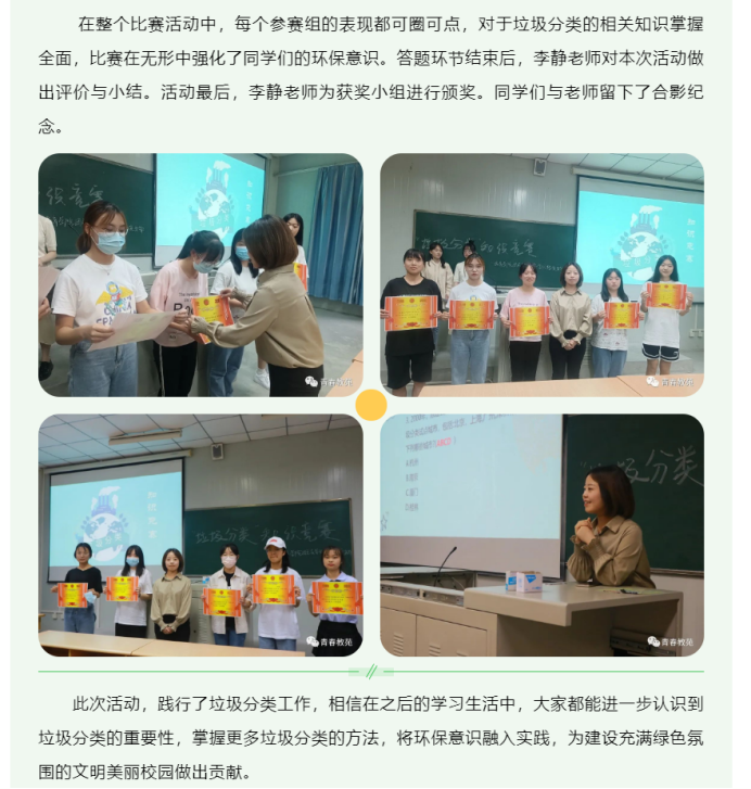 为进一步践行垃圾分类工作,培养同学们的环保意识及能力。太阳成tyc122cc集团于2022年5月开展了“垃圾科学分类,文明你我同行”线上宣传倡议活动,并线下举办了“垃圾分类”知识竞赛,以帮助同学们树立环保意识、营造良好校园文明风尚。