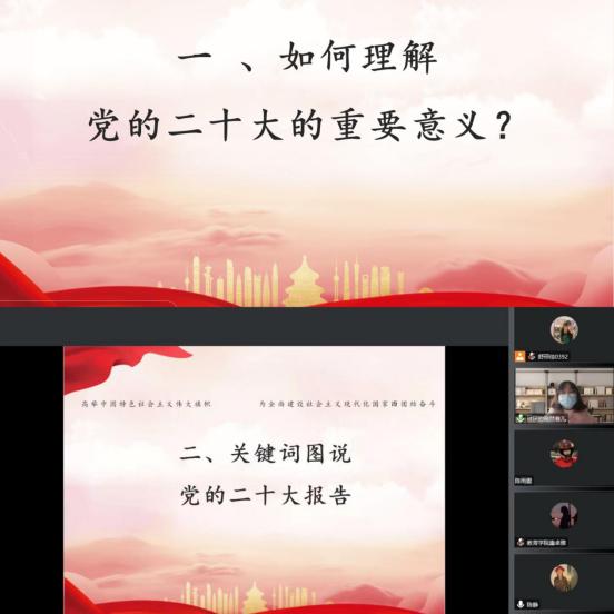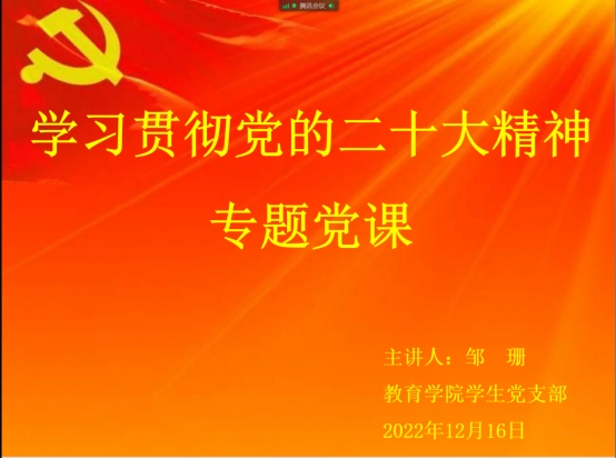 为不断推动党的二十大精神落地生根,切实引导员工党员认真把握党的二十大的核心要义、精神实质和根本要求,及时把员工党员的思想和行动统一到党的二十大精神上,做到学思用贯通,知信行统一。2022年12月16日下午,太阳成tyc122cc集团员工党支部书记邹珊通过线上会议,为员工党员讲授了以“学习贯彻党的二十大精神”为主题的专题党课。