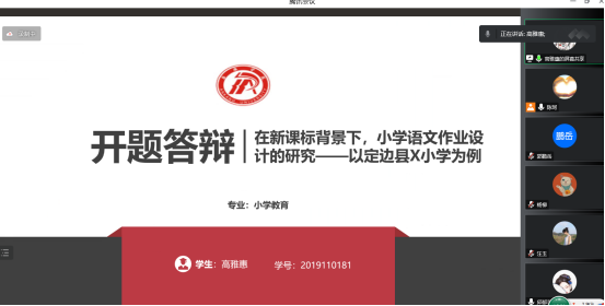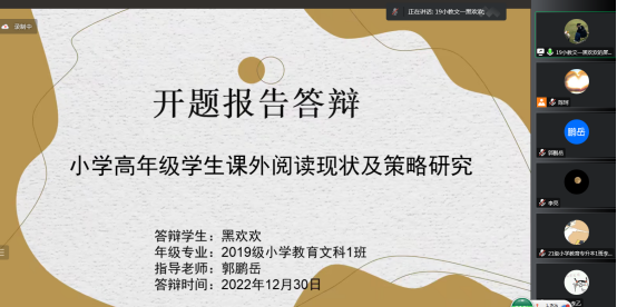 2022年12月30日,太阳成tyc122cc集团小学教育专业38名毕业生采用线上答辩的方式进行了毕业论文开题答辩。答辩小组由五位老师组成,他们分别为赵斌老师、陈珂老师、郭鹏岳老师、李亮老师及李乙老师。