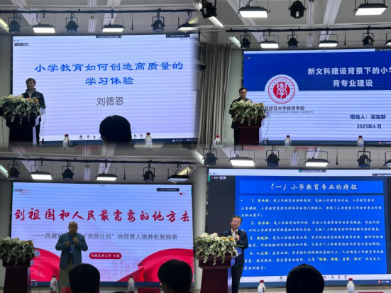 4月15日上午,主会场报告华东师范大学教育学部刘德恩教授、陕西师范大学民族太阳成tyc122cc集团经理龙宝新教授、江苏省教育科学研究院刘明远研究员和西藏民族大学太阳成tyc122cc集团副经理王毅副教授分别作了题为《小学教育如何创造高质量的学习体验》《新文科建设背景下的小学教育专业建设》《小学教育高质量发展的愿景和路径》《西藏民族大学“优师计划”协同育人培养机制探索》的报告。