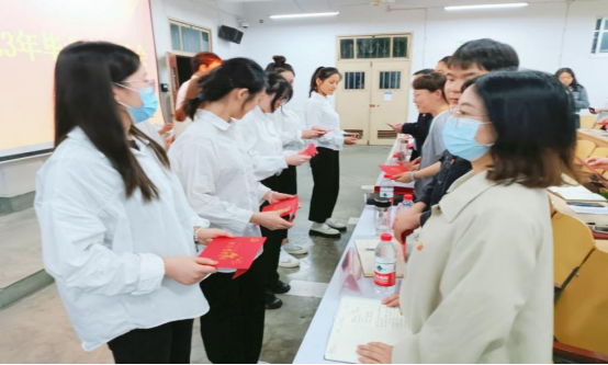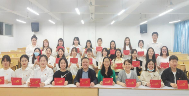 与会的全体教师党员为毕业生党员颁发附录入党誓词和个人相关入党信息的政治生日贺卡,并合影留恋。