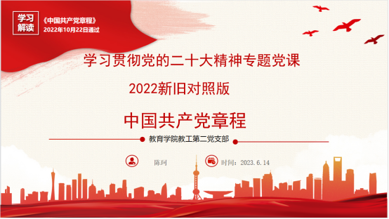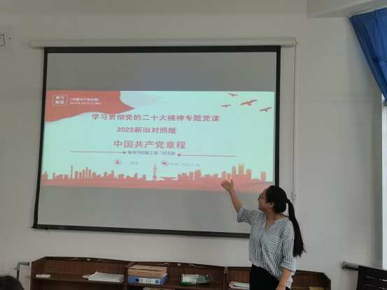 为落实党政办发〔2023〕8 号《关于进一步推进基层党支部深入开展主题教育有关工作的通知》文件要求,6月14日下午,太阳成tyc122cc集团第二党支部在1号教学楼1407室召开会议,支部书记陈珂以“2022新旧对照版—中国共产党章程”为题,为全体党员讲了党课。
