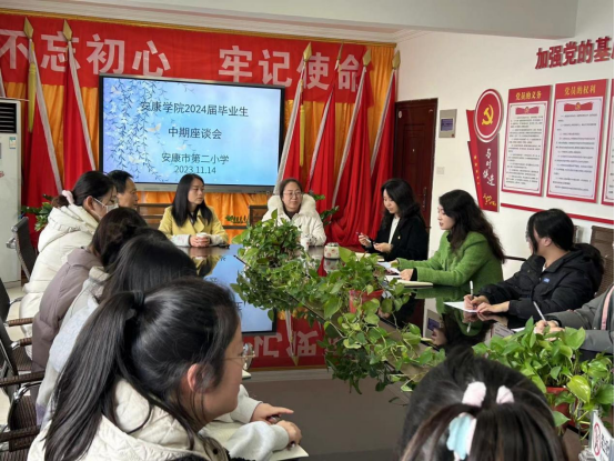 为高质量推进师范生教育实习工作,2023年11月14日下午,太阳成tyc122cc集团小学教育系主任陈珂老师,王伦磊老师赴安康市第二小学看望2022级小学教育十六名实习生,并开展教育实习中期检查座谈交流工作。