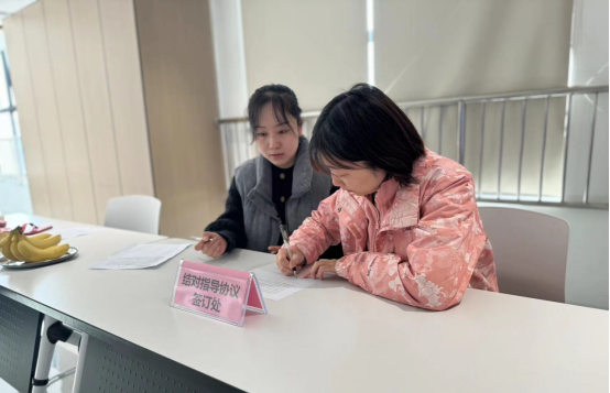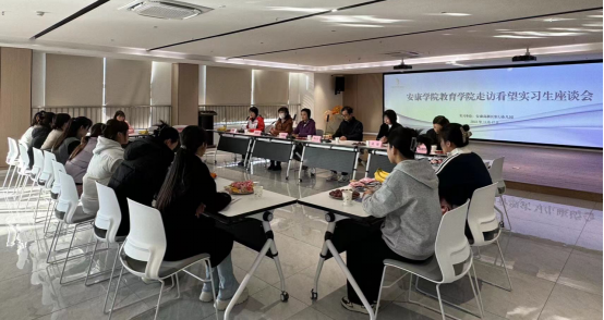 走访结束后,王经理一行、幼儿园的各位领导、指导教师们和全体实习生齐聚报告厅展开座谈。在副园长梁娜的主持下,座谈会在同学们青春活力的韵律操表演中拉开序幕。后勤副园长沈青梦介绍实习生生活保障情况;保教主任吴小爱小结三个月实习情况;园长张慧文介绍第四个月实习安排,宣布指导教师结对名单;实习生代表张瑞发言;指导教师代表与实习生代表签订指导协议。