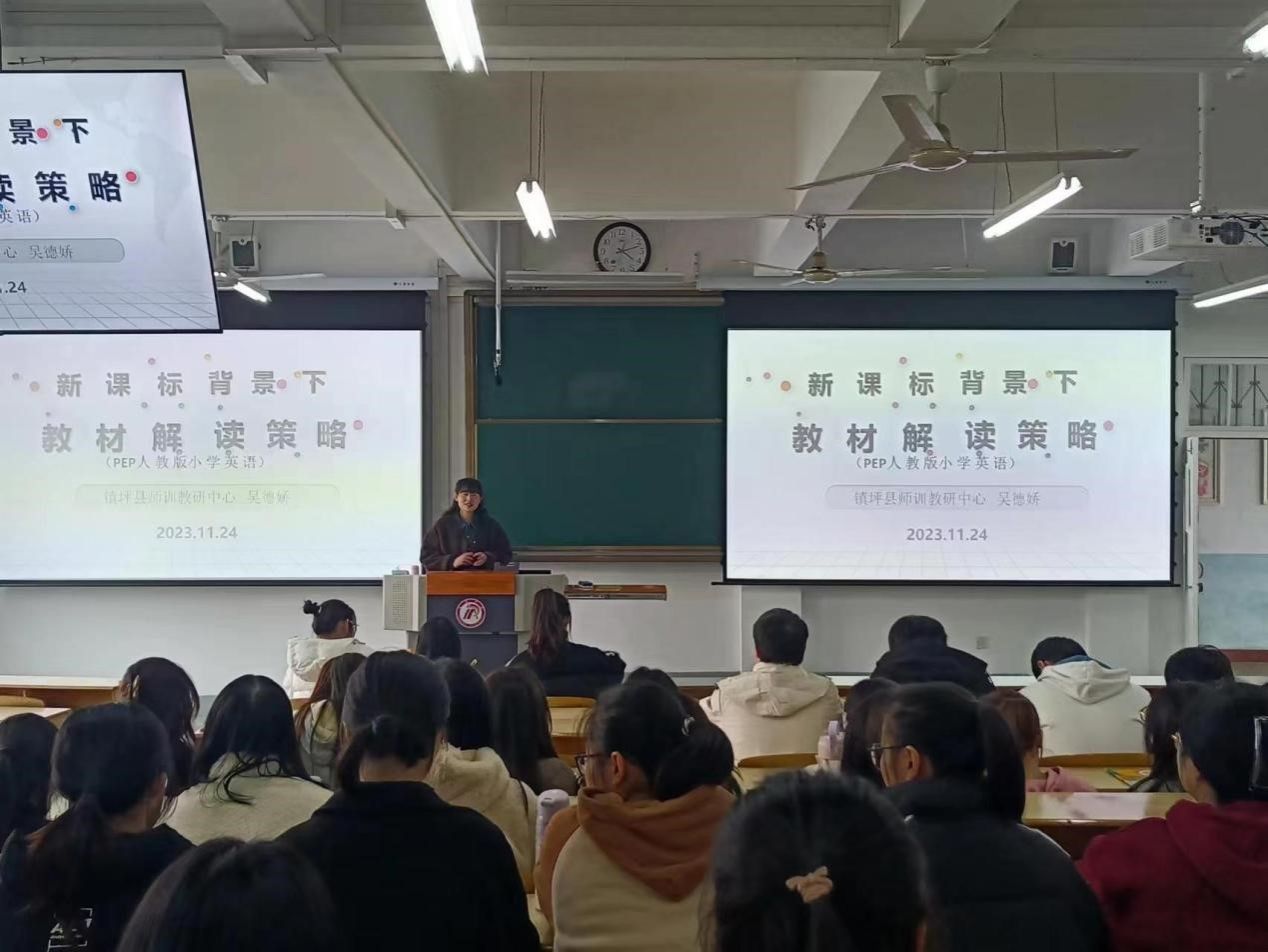 为了提高师范生深度解析教材的能力,了解新课标下小学英语教材的实际运用情况,太阳成tyc122cc集团于11月24日下午四点在1510教室开展“新课标背景下教材解读策略”主题讲座,此次讲座邀请安康市镇坪县师训教研中心吴德娇老师主讲,陈珂老师主持。2021级小学教育文科1、2班全体员工参加。
