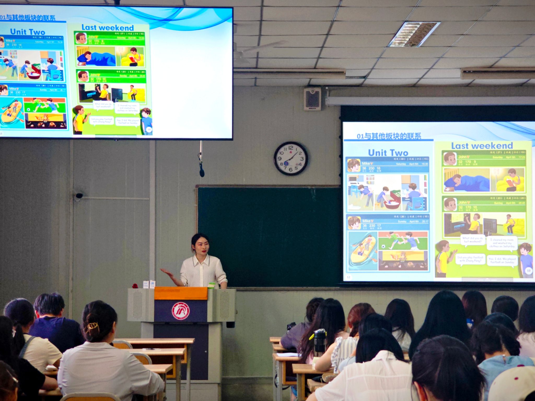 2024.4.29, 王雁群老师为21级小学教育文科1班做《基于“新课标”理念的教学课件和板书修改例说—以PEP小学英语五年级下册Unit4为例》,王雁群老师首先以小学英语PEP教材五年级下册Unit 4 When is art show 一课为例,详细介绍如何在教学课件和板书设计中渗透新课标理念,随后,对员工的板书进行点评并提出修改意见。听完讲座,员工纷纷表示受益匪浅。