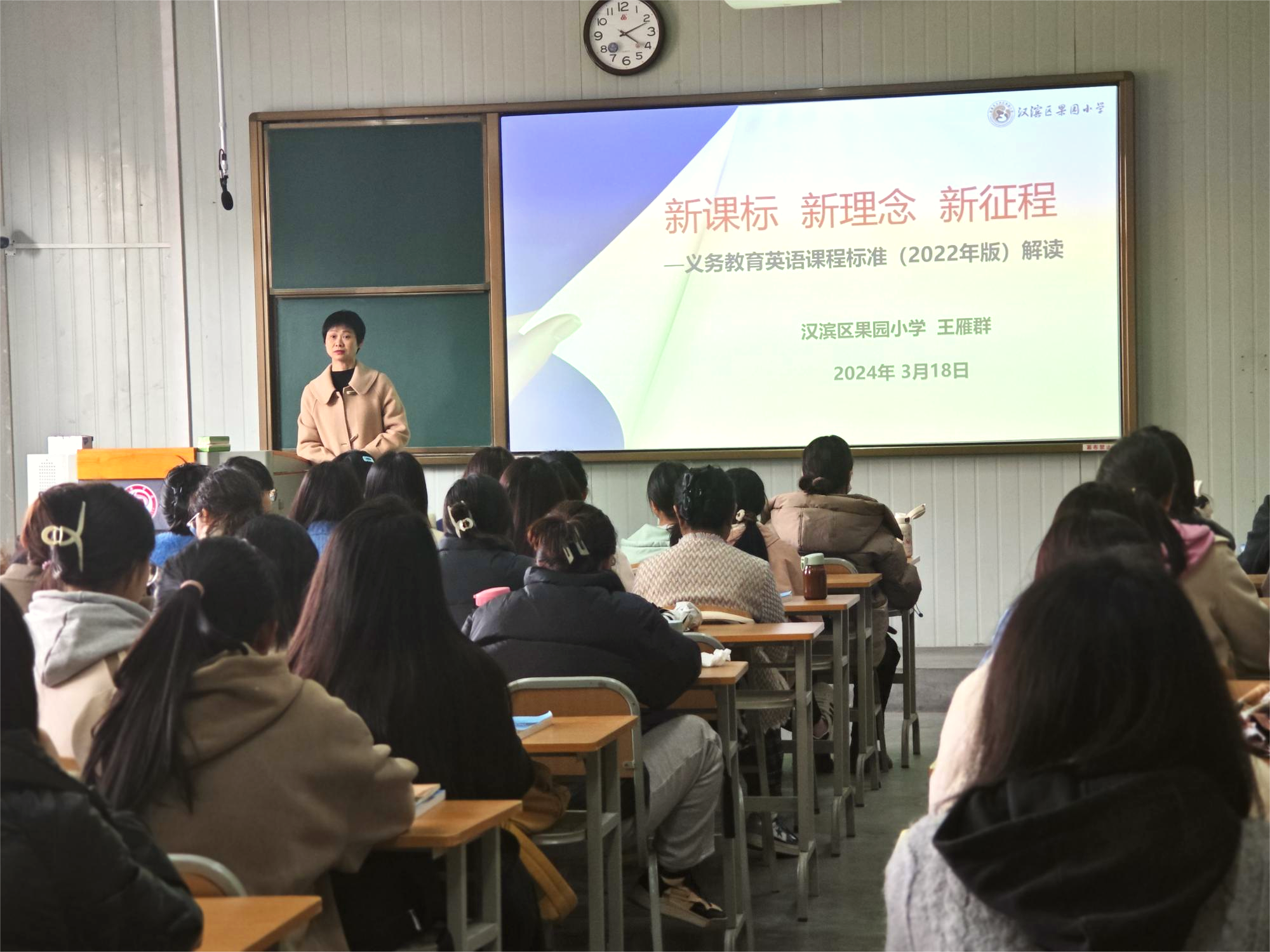 2024.3.18,省教学能手、果园小学王雁群老师23级小学教育专业专升本1.2班做了专题讲座《新课标 新理念 新征程—义务教育英语新课程标准(2022版)解读》,王雁群老师从新课程标准修订的原因谈起,结合案例对课程性质、课程理念、课程目标、课程内容等方面进行解读。