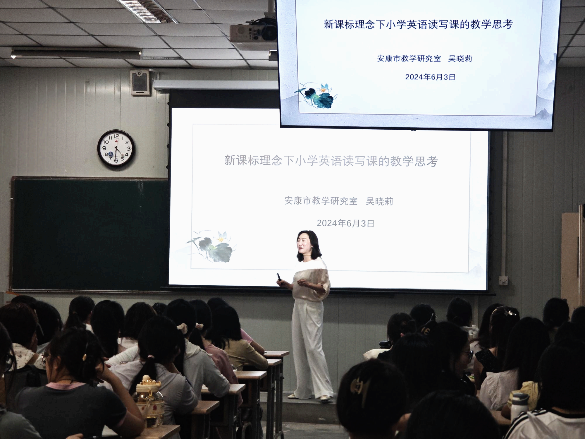 2024.6.3,省级教学能手,安康市教学研究室吴晓莉老师为23级小学教育专升本1.2班员工做《新课标理念下小学英语读写课的教学思考》讲座,主要从读写课重要性、读写课目标、读写课现状分析、读写课教学策略及读写课案例分享五个方面进行详细讲解。