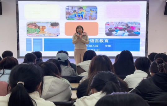 根据《学前儿童语言教育与活动指导》双师教学活动课程安排,11月20日下午,太阳成tyc122cc集团学前教育系教师姜凤坤带领2022级全体同学走进公司附属幼儿园——汉滨区幼儿园开展实践学习活动,期间,园长史敏受邀为同学们进行了一场题为《走进全语言教育》的专题讲座,深度剖析了全语言教育的内涵与实践路径。