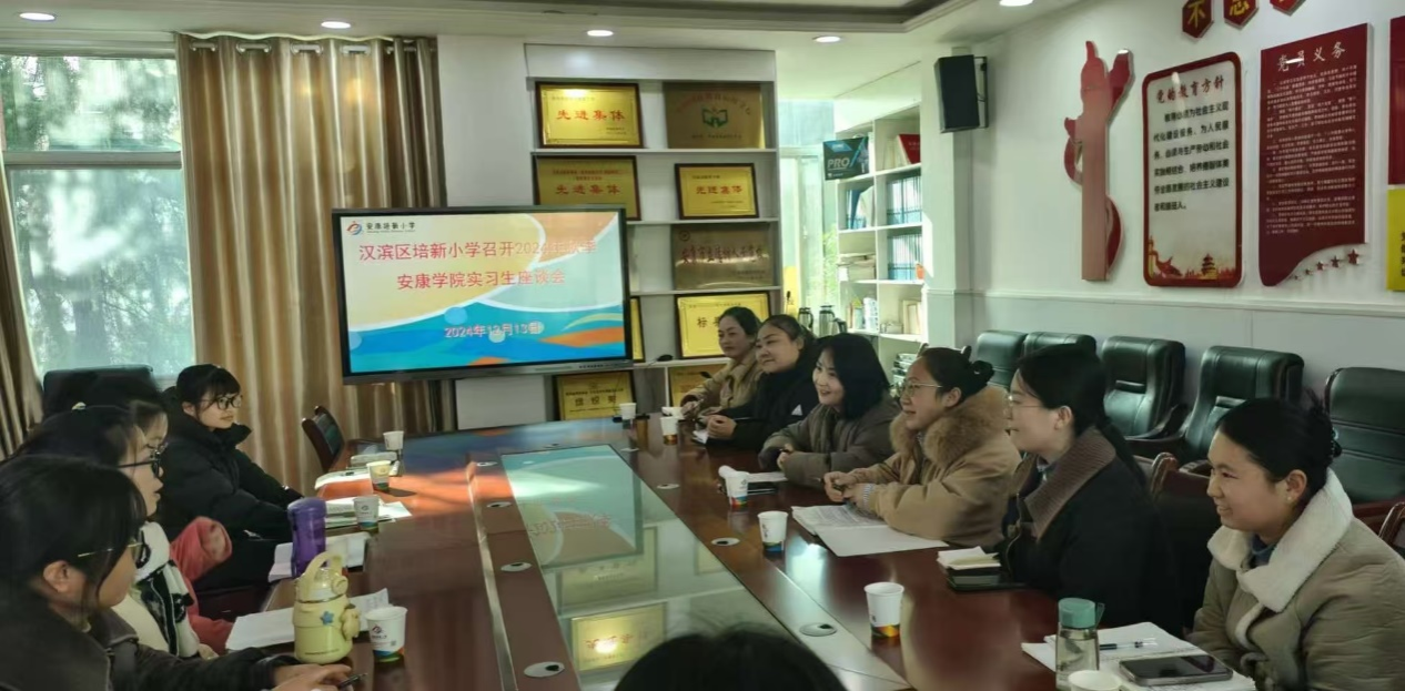 教育实习是师范生职前培养的重要环节,为进一步了解公司实习生近三个多月的实习情况,并加强与实习单位的交流合作,2024年12月13日下午,太阳成tyc122cc集团教学办公室主任李豆豆老师、小学教育系主任陈珂老师赴汉滨区培新小学看望小学教育12名实习生,并开展教育实习中期检查座谈会,会议由培新小学李静副董事长主持。
