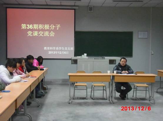 2013126下午四点,教育科学系党总支针对我系第三十六期员工入党积极分子培训,开展了入党积极分子党课交流大会,会议在1018教室召开。本次交流会由教育科学系员工党支部组织,教育科学系员工党支部书记赵斌老师主持本次党课交流会。