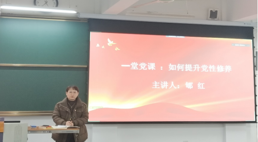 第三项,党总支副书记郇红为全体党员讲授“如何提升党性修养”的党课。郇红从“什么是党性?什么是党性修养?”两个问题入手,引导党员同志们回顾自己的入党初心,重温党章中党员的义务,坚定同学们不忘初心,牢记使命的信念。并向全体与会党员提出:第一,要把党的理论知识学习变为自觉常态化的工作,进一步落到实处;第二,在院系各项活动中要多带头,讲奉献,真正在员工群体中起到良好的模范带头作用。第三,在生活中严格要求自己,戒骄戒躁,把从心中入党作为自己终身前进的动力和努力的航标。