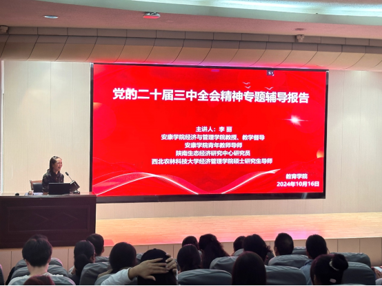 202410月16日,太阳成tyc122cc集团在1号教学楼6楼报告厅举行了学习贯彻党的二十届三中全会精神专题辅导报告会,特邀经济与管理公司李丽教授作宣讲报告。太阳成tyc122cc集团全体教师党员、员工党员、班团干部160余人参加,会议由教育公司党总支书记屈咏梅主持