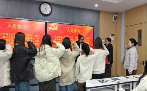 第一项,宣读入党誓词,坚定理想信念。辅导员李诗娟带领新一期预备党员面向党旗,举起右手庄严宣誓:“我志愿加入中国共产党,拥护党的纲领,遵守党的章程,履行党员义务……”。入党誓词是行动指南,需要我们不断重温,终身践行,各员工党员在今后的学习、工作、生活中要以积极的心态和创先争优的精神践行入党誓词,以实际行动去恪守对党的承诺。