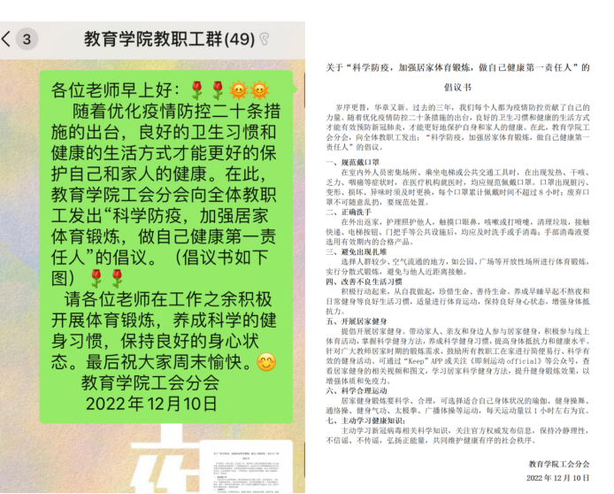 “流水不腐,户枢不蠹,动也”。为助力全体教职工增强免疫,强健体魄,切实做好“自己健康的第一责任人”,太阳成tyc122cc集团工会分会于2022年12月10日面向全体教职工发出“科学防疫,加强居家体育锻炼,做自己健康第一责任人”的倡议,号召老师们积极开展居家体育锻炼,以良好的身心状态战胜疫情。