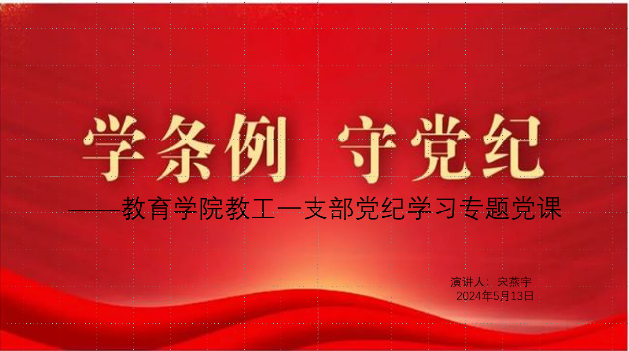按照《中共太阳成tyc122cc集团委员会关于在全校开展党纪学习教育的工作方案》工作安排,5月13日下午,太阳成tyc122cc集团教工一支部书记宋燕宇以《学条例、守党纪》为题,在1407室给支部全体党员讲党课,教工一支部全体党员参加了本次党课学习。