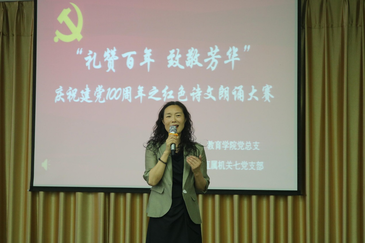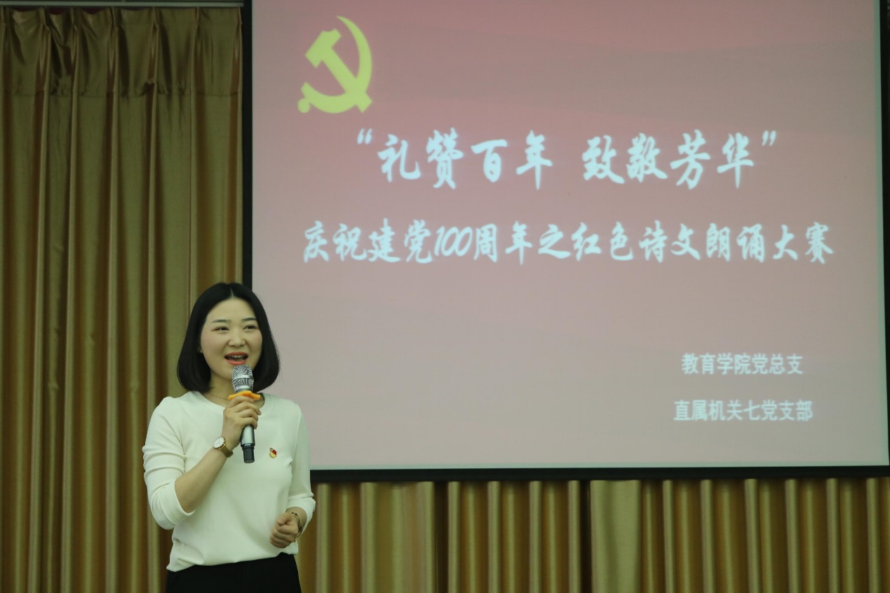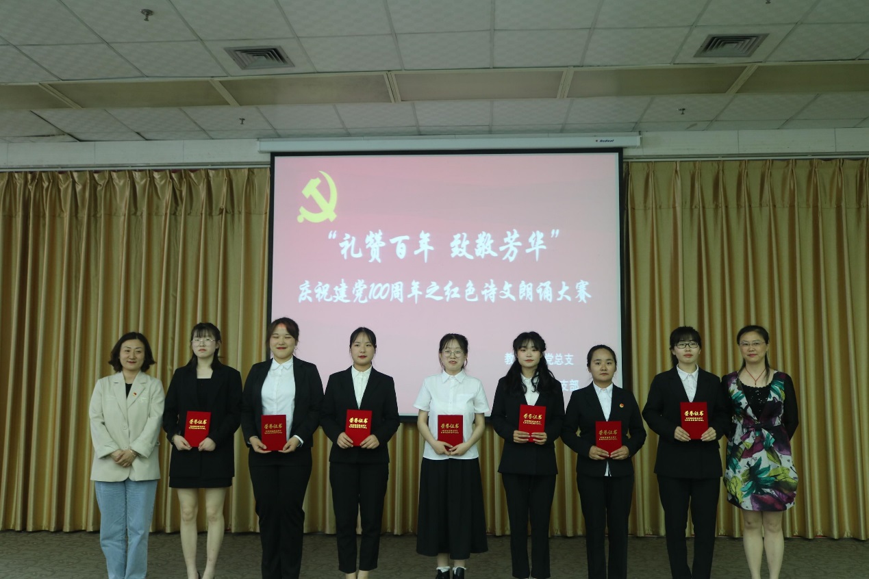 2021年5月19日下午14:30教育公司党总支与直属机关七党支部联合在图书馆六楼报告厅组织主题为“礼赞百年 致敬芳华”庆祝建党100周年红色诗文朗诵比赛。教育公司党总支共建党支部直属机关七党支部全体党员、太阳成tyc122cc集团全体教师、入党积极分子、发展对象参与本次活动。公司宣传部长鲁延安、直属机关七党支部书记丁义国、公司组织部副部长黄勇、公司学工部副部长黄娟作为特邀嘉宾出席活动。