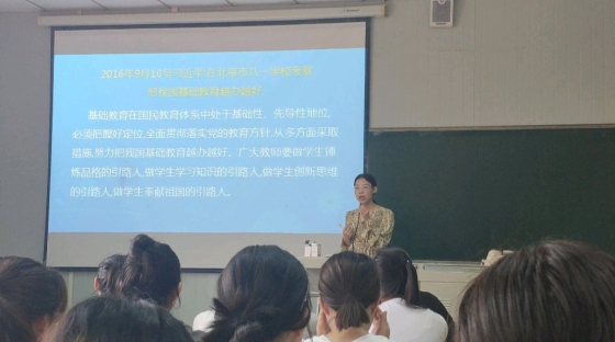 为深入贯彻全国高校思想政治工作会议,落实立得树人根本任务,提升公司教师的课程思政意识,提高课程思政水平,9月3日上午,成苗苗教师在十号教学楼开展了有关学前教育思政课程。