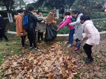 下午四点,同学们自行携带清扫工具,在清洁区域准时集合。由团总支成员进行分组后,同学们积极投入清洁树叶工作。由于树叶飘落过多,花坛落叶堆积厚度可见一斑,加上天气严寒,给清扫工作带来了诸多不便,但同学们以饱满的热情投入到清扫工作中。寒风凛冽,大家双手通红,一边感叹清扫不易,一边感慨如此环境下仍然坚守岗位的叔叔阿姨的艰辛。同学们或是用扫帚将大堆落叶挪到一起,或是用手捡起路边的垃圾,或是用小树枝轻轻拂去落在灌木丛上边的落叶。团总支成员为大家借来大号清洁袋,方便进行树叶分装工作。有的同学清理树叶,有的同学便用簸箕将树叶扫入清洁袋,在工作中体会集体的力量。清洁结束,男生积极将所有垃圾运送到垃圾箱。同学们良好的精神风貌为冬日的校园增添了些许温暖,活动在清洁后干净整洁的校园和大家满足的会心一笑中结束。